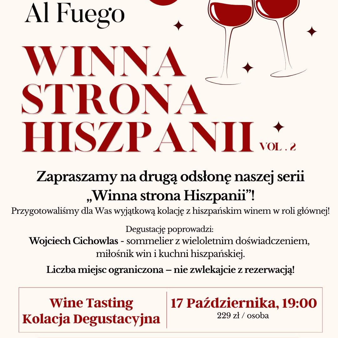 Jesienne wieczory mają swój niepowtarzalny klimat – to czas, w którym warto zwolnić tempo i dać się porwać kulinarnej podróży pełnej aromatów, smaków i historii. Już 17 października w restauracji Al Fuego odbędzie się wyjątkowe wydarzenie dla miłośników wina i dobrej kuchni: elegancka kolacja degustacyjna z selekcją win hiszpańskich.